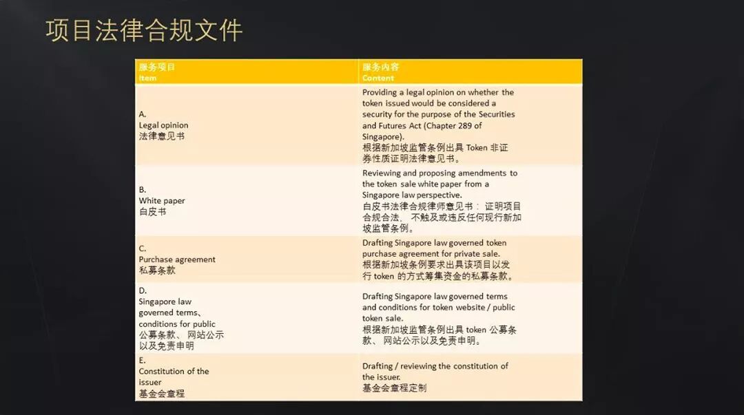 按照项目的需求法律合规一般分为两类,其中最重要的部分是白皮书修改以及出具token非证券性质的律师意见指导书。白皮书需要基于新加坡法律做修改:修改针对于白皮书token的应用场景,其中比较敏感的是涉及分红、销毁、回购的场景,很多交易所,包括火币、okex等,都有严格的风控要求所有token必须是utility属性。1