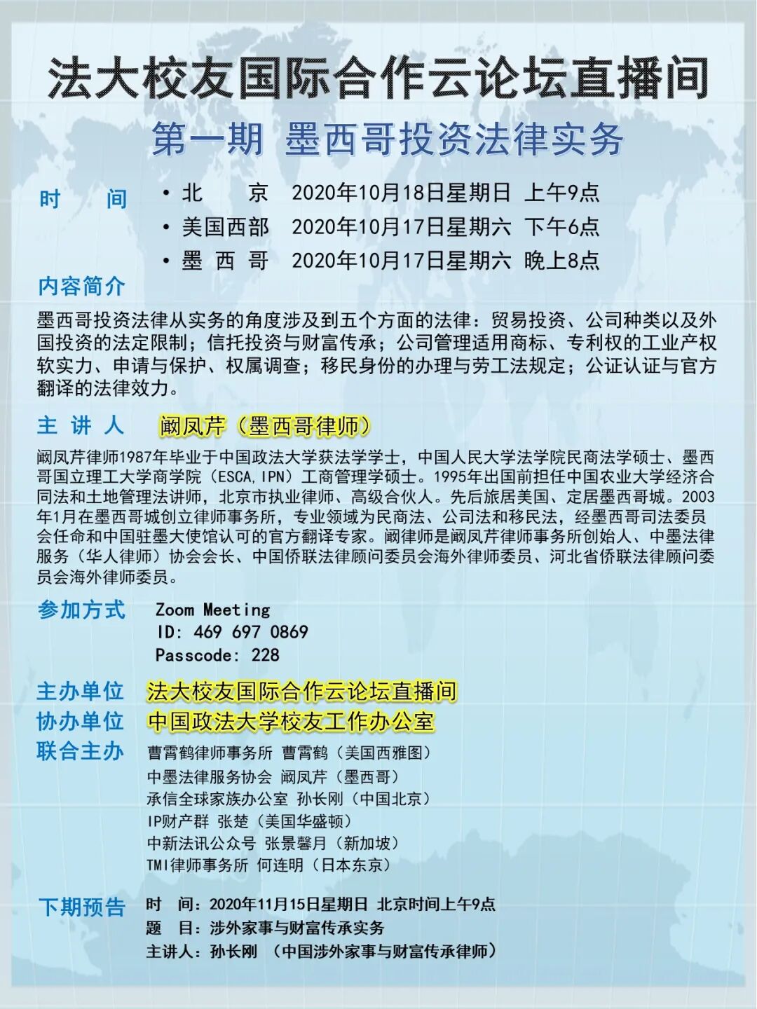 由中国政法大学部分海内外校友设立的“法大校友国际合作云论坛直播间”将开始每月举办以国际合作为目的系列网络讲座。本系列网络讲座的目的是促进海内外校友的交流、凝聚海外校友的智慧、彰显法大精神、传播法大文化、促进共同发展,也期待您的主讲和参与。