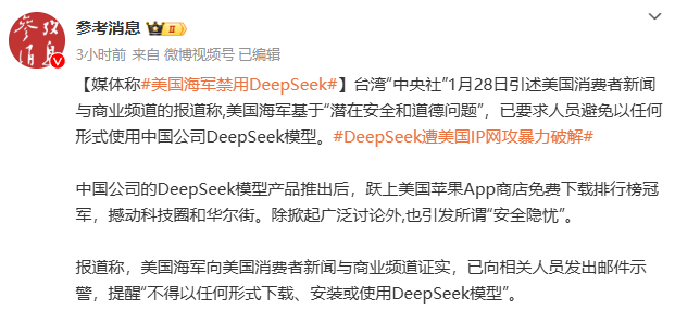 此外,据参考消息报道,美国消费者新闻与商业频道的报道称,美国海军基于“潜在安全和道德问题”,已要求人员避免以任何形式使用中国公司的DeepSeek模型。美国海军向美国消费者新闻与商业频道证实,已向相关人员发出邮件示警,提醒“不得以任何形式下载、安装或使用DeepSeek模型”。