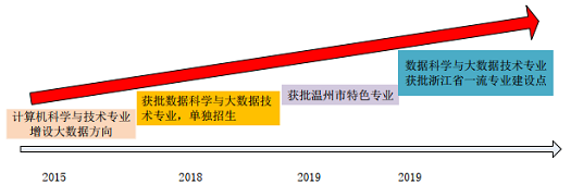 依托省属重点高校“省市共建”计划、省一流专业建设点计划、计算机科学与技术一级学科硕士点专业背景,与2015年计算机科学与技术专业增设大数据方向,2018年全国第三批获批数据科学与大数据专业,2019年分别获得省一流本科专业建设,温州市特色专业。
