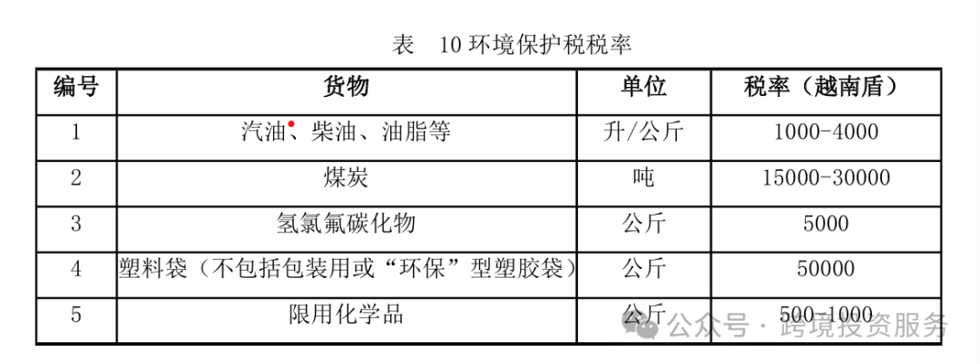 越南国会于2020年11月批准了一项新的环境保护法,该法律将于2022年1月1日生效,上述新法律对环境保护税的规定如下: