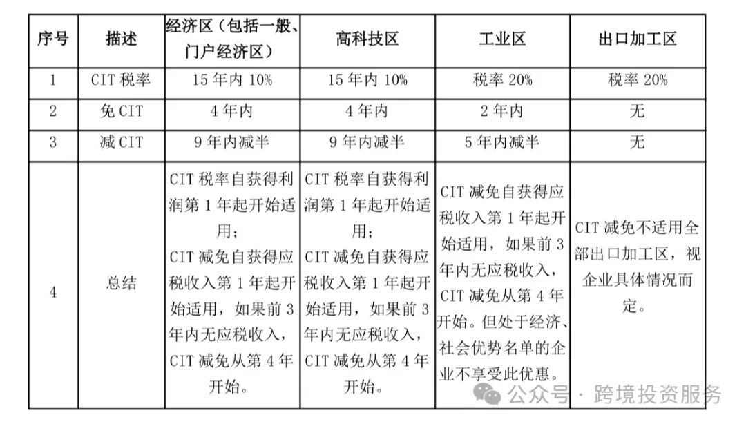 设立在指定的投资区域即经济区、高科技区、工业区和出口加工区 的企业享有优惠的企业所得税税率以及相关奖励措施。企业从符合条件的 活动中获得收入的第一年起适用优惠税率,不同的特殊区域适用不同的税 收优惠政策,具体见表 2: