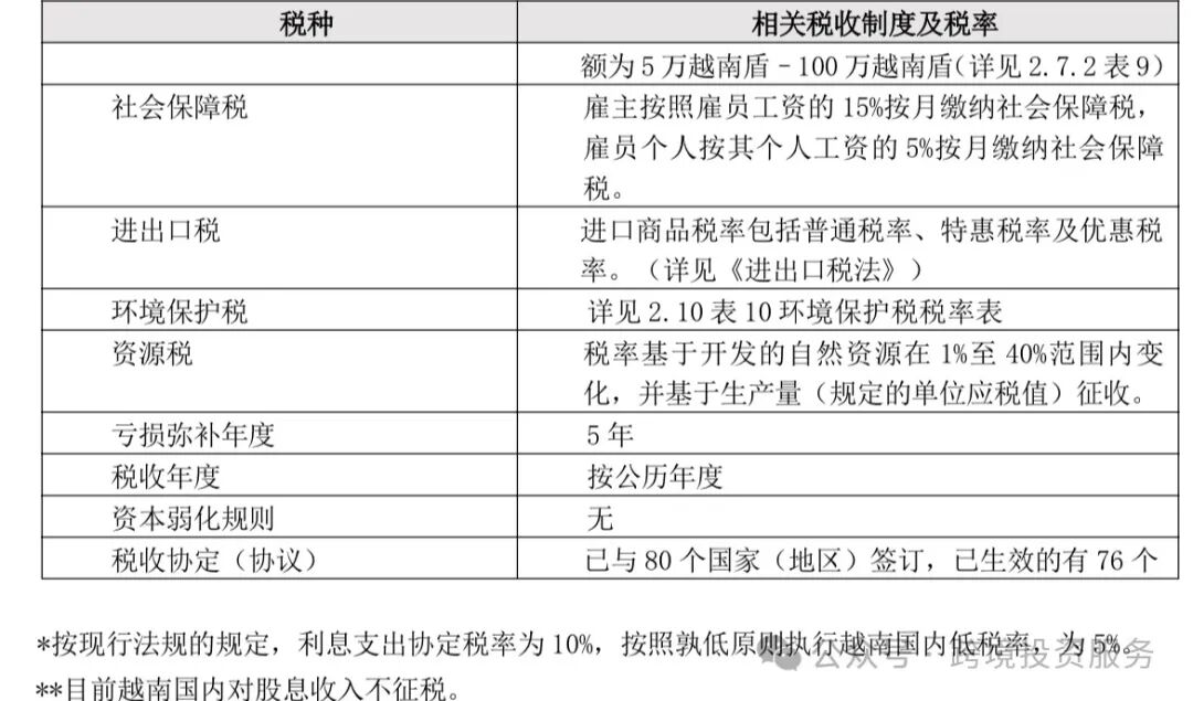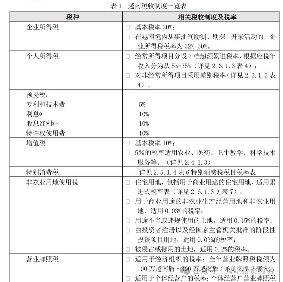 越南现行的税收法律法规设有以下税种:企业所得税、增值税、个 人所得税、预提所得税、特别消费税、非农业用地使用税、营业牌照税、 社会保障税、进出口税、环境保护税、资源税等,以下是越南税制基本情 况归纳: