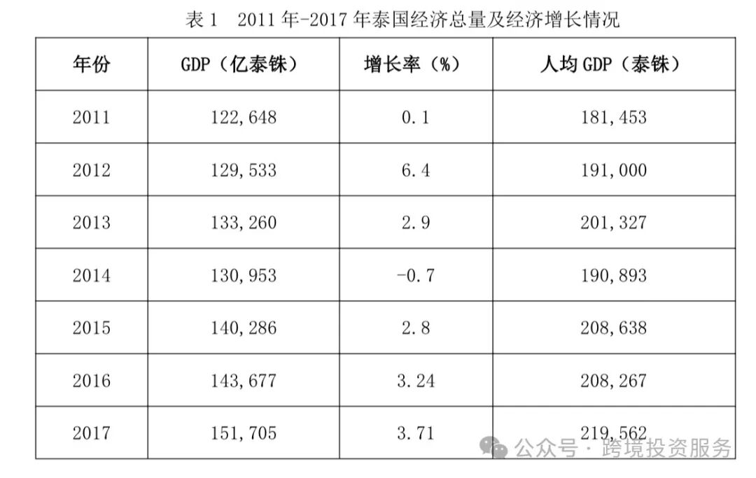 受全球金融危机影响,泰国经济发生波动,2010 年后一直都呈 现正增长,2010 年和 2012 年分别出现 7.8%和 6.4%的高增长率。2013 年以来受政治动荡和全球经济复苏乏力影响,经济增长回落,在 2014 年出现负增长之后,目前经济增长率缓慢回升。
