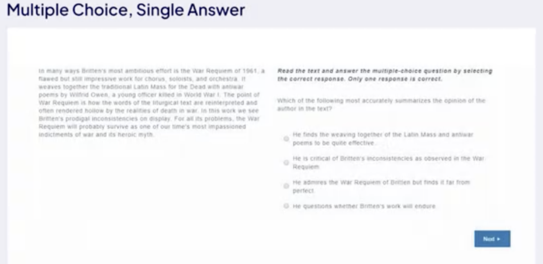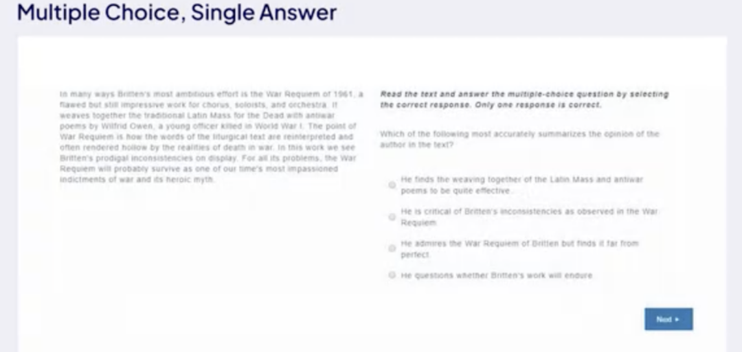 题型任务:读一篇 300 词的文章(比如 “Britten 的《战争安魂曲》”),选唯一正确的选项,考查作者观点或主旨。