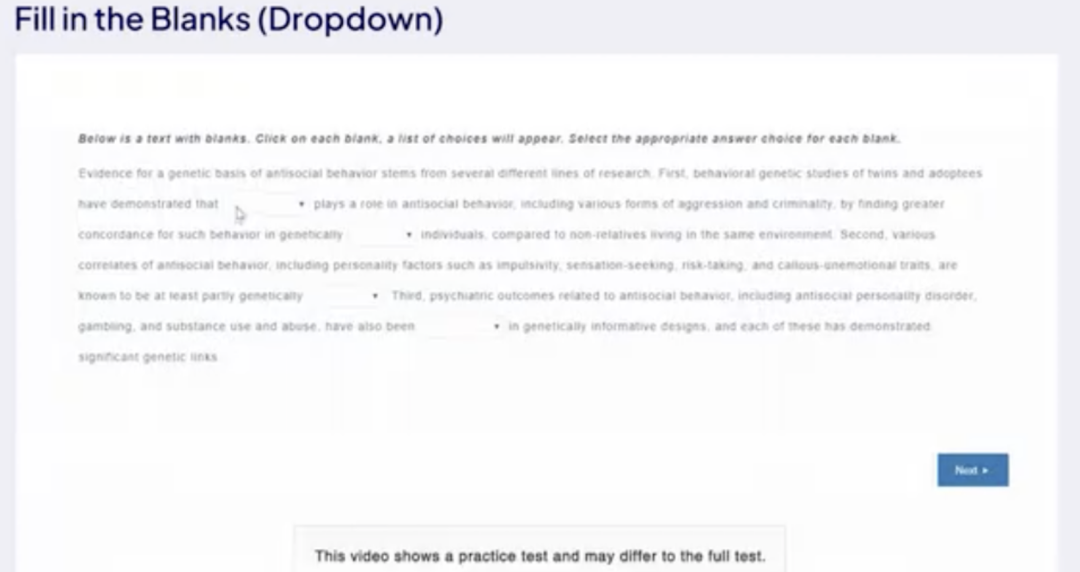 题型任务:读一篇 300 词的文章,从每个空的下拉列表里选最合适的词(比如选 “genetics”“environment”“inherited” 等),考查词汇搭配与上下文理解。