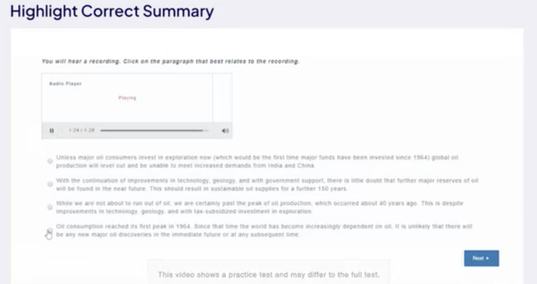 题型任务:听一段 30-90 秒的录音(比如 “石油产量分析”),选最贴合的总结段落,考查听力主旨理解。