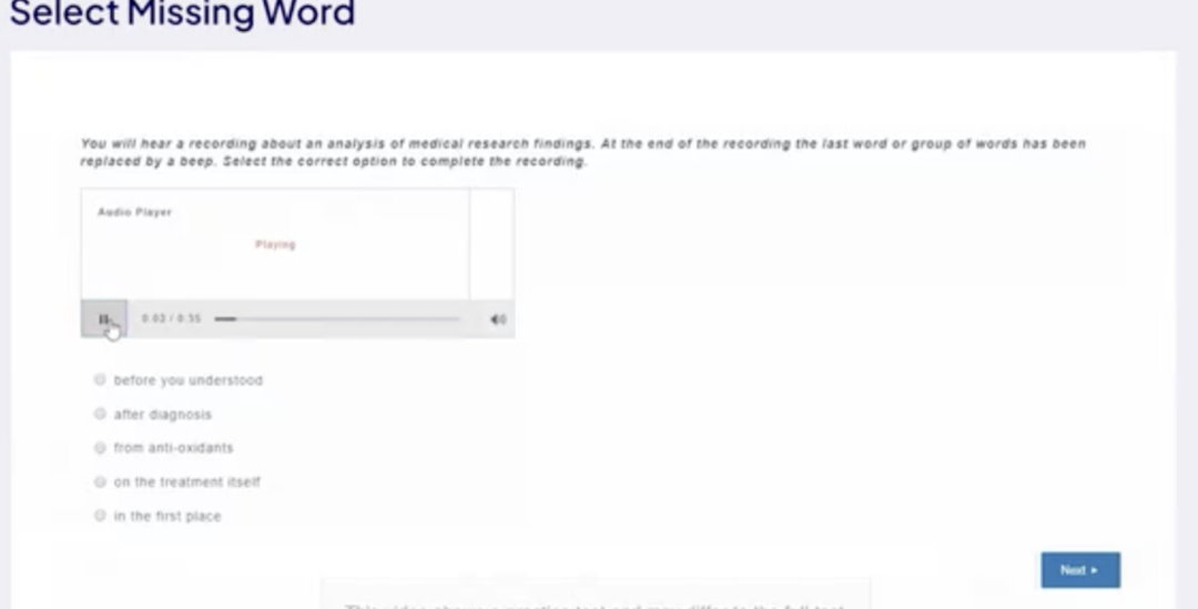 答题关键:听前看选项(如 “before diagnosis”“on the treatment”),听的时候抓 “上下文逻辑”(比如录音讲 “医疗研究”,结尾说 “the key is to act ____”,选 “before diagnosis” 更合理)。