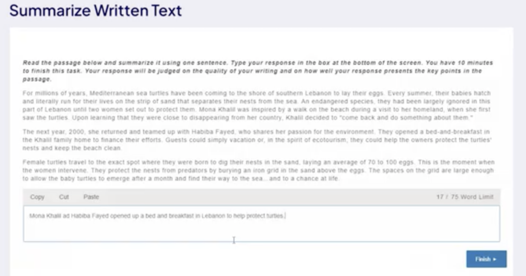答题关键:笔记记 “谁 + 事件 + 时间 + 结果”,总结用 “客观语气”(别加自己观点),比如 “An interview discusses two women protecting sea turtles in Lebanon: they opened a B&B to get funds, used iron grids to guard nests, and helped baby turtles reach the sea.”