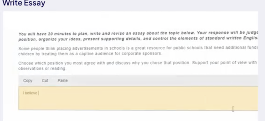 答题关键:先明确立场(“I think placing ads in schools is not a good idea”),再用 2 个理由支撑(如 “it distracts students”“it pushes commercial values to kids”),最后总结;别超词数(200 词底线要够,300 词上限别超)。