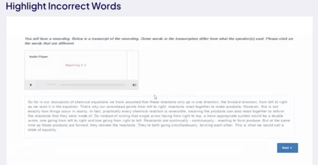 题型任务:听一段 15-50 秒的录音,对照屏幕上的文稿,点击 “与录音不一样的词”,考查听力辨错与细节比对。