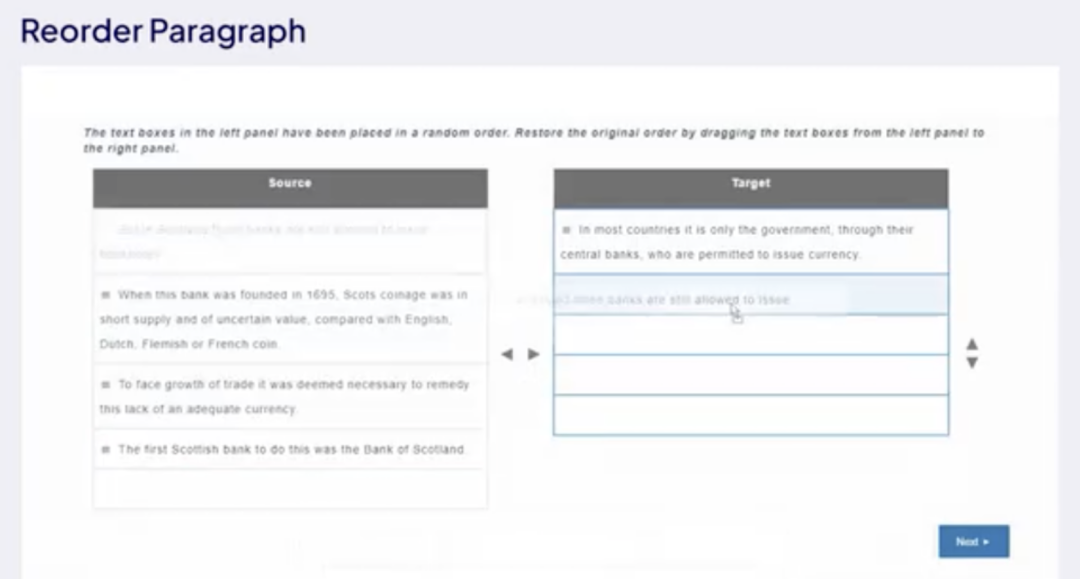 题型任务:把 4-5 个打乱的文本框(总词数 150 左右)按正确顺序拖到右边,考查逻辑连接(如指代、因果、时间)。