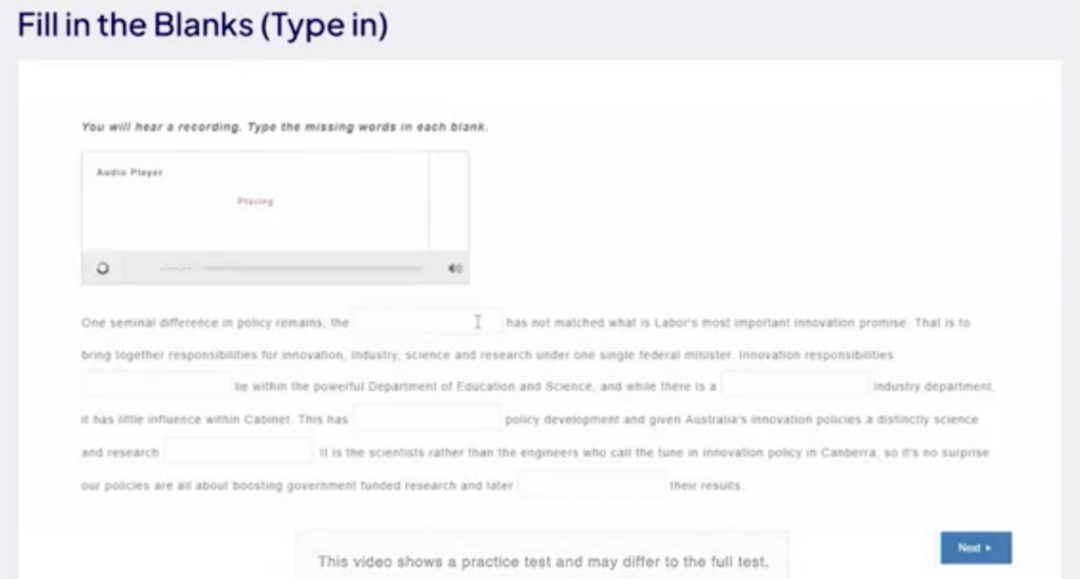 题型任务:听一段 30-60 秒的录音(比如 “政策讨论”),原文已给出但缺词,听到缺词就打字填入,考查听力辨词与拼写。