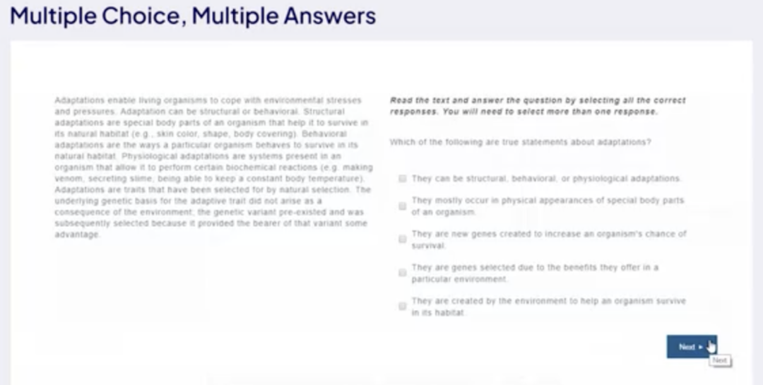 题型任务:读一篇 350 词的文章(比如 “生物适应性”),选 2 个以上正确选项,考查细节理解。