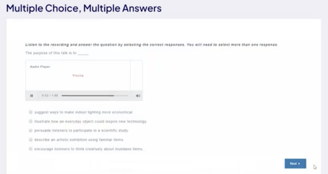 题型任务:听一段 80-120 秒的录音(比如 “科技讲座”),选 2 个以上正确选项,考查听力细节抓取。