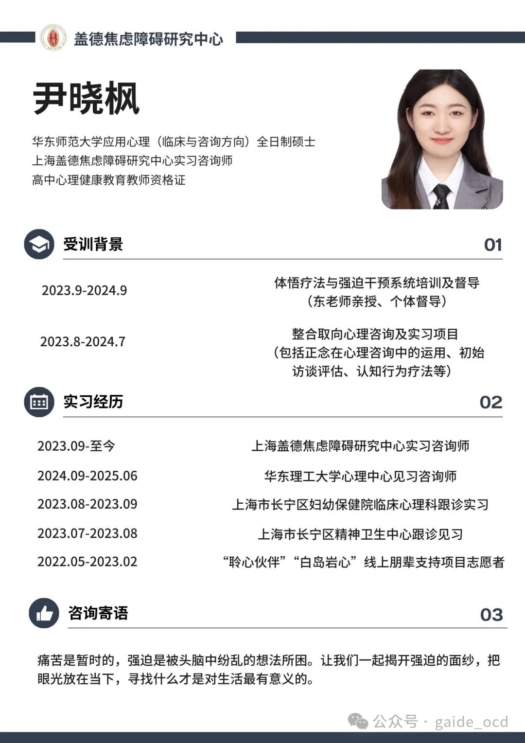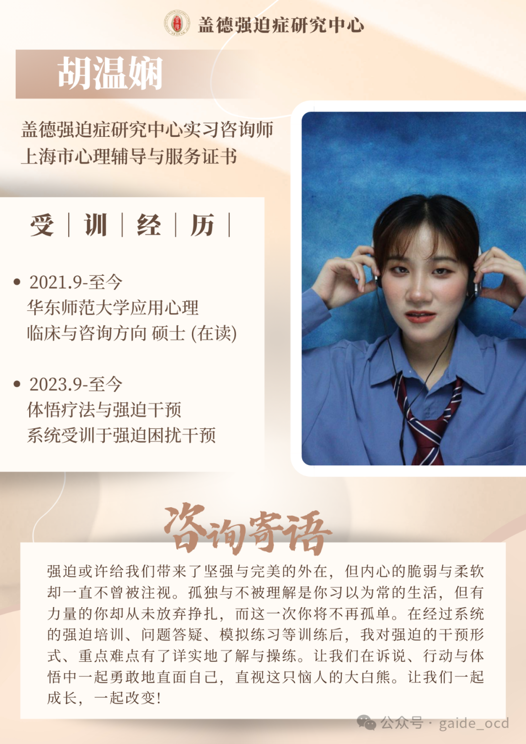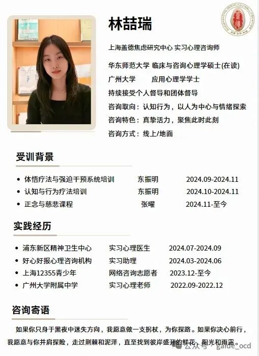 上海盖德强迫症研究中心成立于2004年,专注于强迫症的研究与咨询20余年,在咨询方面拥有扎实的理论基础和丰富临床经验。机构2011年加入国际强迫症研究基金会,成为会员。2009年出版《走出强迫症 找回美丽的日子》,2013年组织翻译《强迫症的正念治疗手册》,2017年出版《做出强迫症2正念体悟疗法自助手册》,2022年出版《如何战胜强迫症:体悟疗法自助指南》《自由的你:体悟疗法与强迫症干预》2025年《体悟人生 让心灵自由穿行》同时,我们也致力于人才的培养,为华东师范大学及美国宾夕法尼亚大学实习基地!