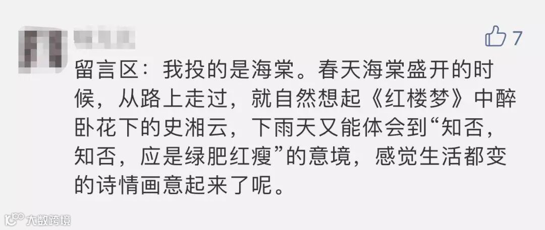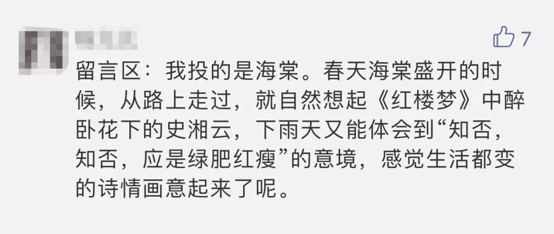 另一位公众号粉丝的留言非常有诗意,TA表示,自己是为海棠投的票。春天海棠盛开的时候,从路上走过,就自然想起《红楼梦》中醉卧花下的史湘云,下雨天又能体会到“知否,知否,应是绿肥红瘦”的意境,感觉生活都变的诗情画意起来了呢。