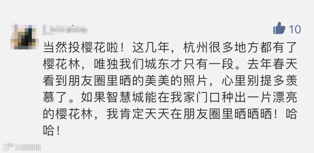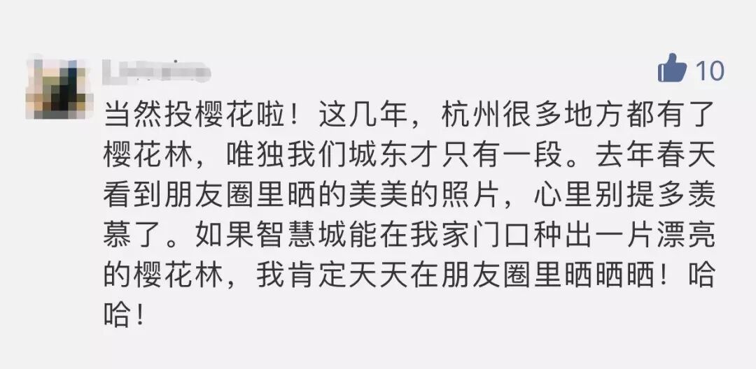 有位粉丝说:当然投樱花啦!这几年,杭州很多地方都有大片大片的樱花林,唯独我们城东才只有一段。去年春天看到朋友圈里晒的美美的照片,心里别提多羡慕了。如果智慧城能在我家门口种出一片漂亮的樱花林,我肯定天天在朋友圈里晒晒晒!哈哈!