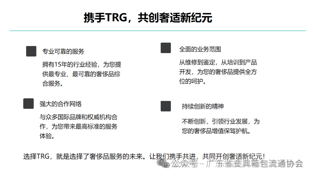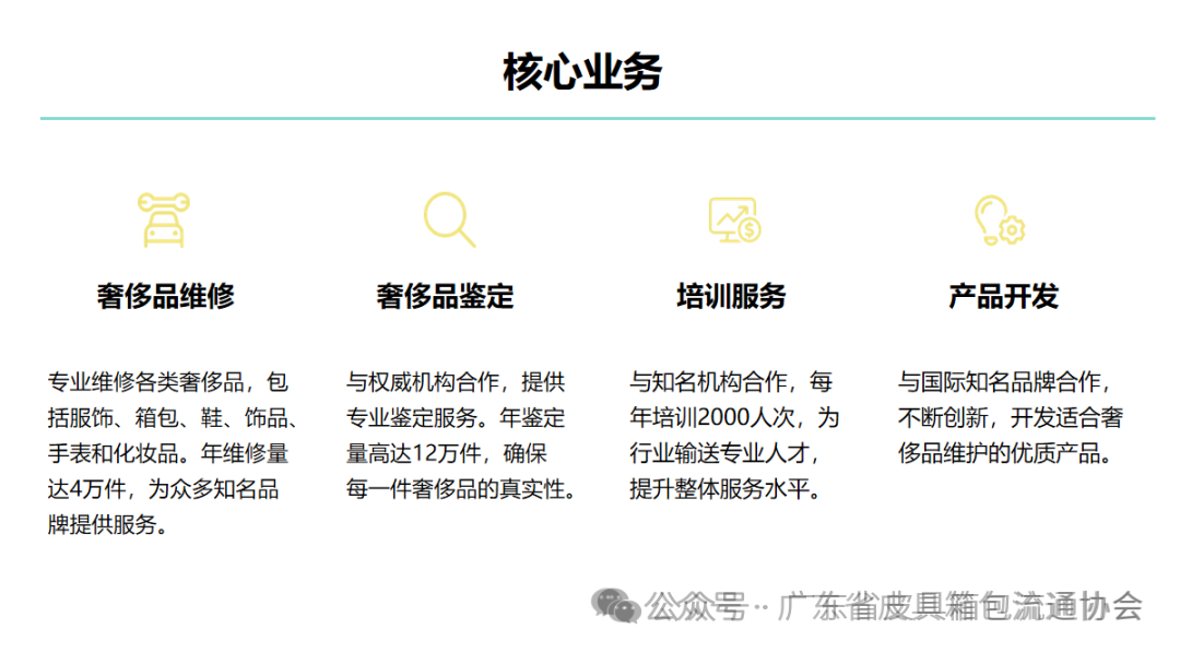 其企业有:奢侈品维修、奢侈品鉴定、培训服务及产品开发四大板块业务。企业与广检、中检、广州海关技术中心等权威机构建立合作;电商平台则与抖音、天猫及唯品会合作。从维修到鉴定,从培训到产品开发提供全方位的服务。