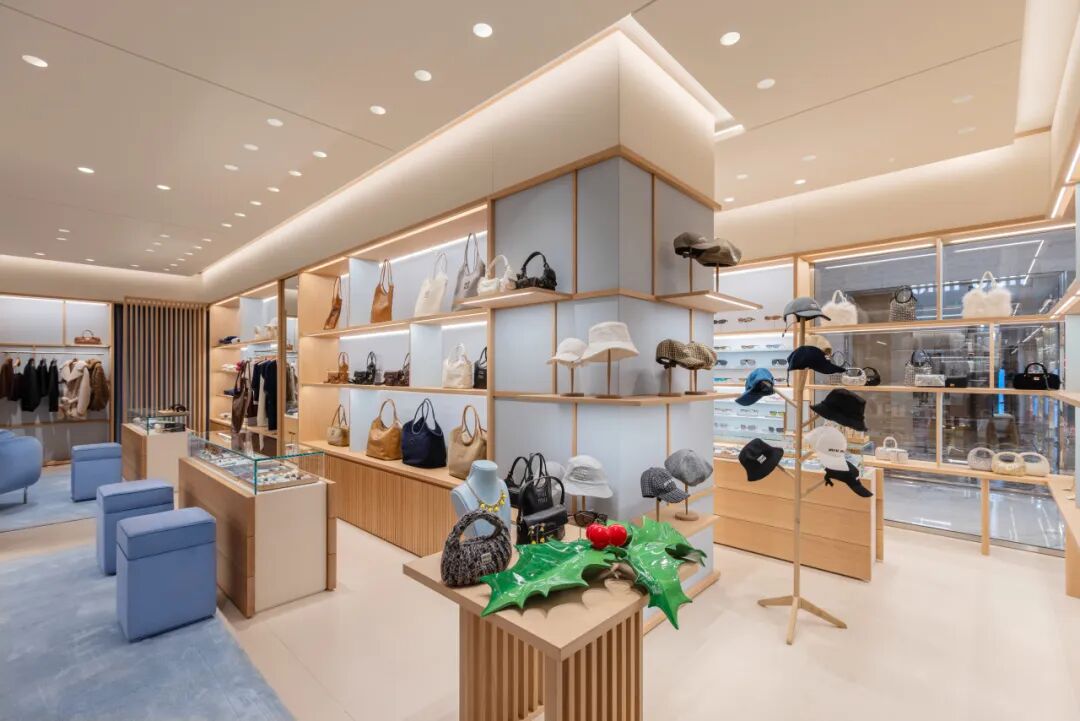 Miu Miu欣然宣布,其落址于久负盛名的北京SKP精品店重装焕新。精品店风格焕现新颜,汲取20世纪中叶欧式设计美学,渲染私密氛围。木艺装置沿墙面铺展,贯通空间,融合天然木料与天蓝色帆布。纹理各异的天然木料与品牌标志性天蓝色调相映成趣,形成单色“盒体”视觉效果,巧妙平衡极简主义与现代优雅,营造温馨惬意环境。店铺中心区域,产品雅致展陈于木质及大理石柜台以及木质桌台。简约玻璃和钢质陈列柜、桌台及沙发与蓝色地毯交相辉映,散逸奢华气息。