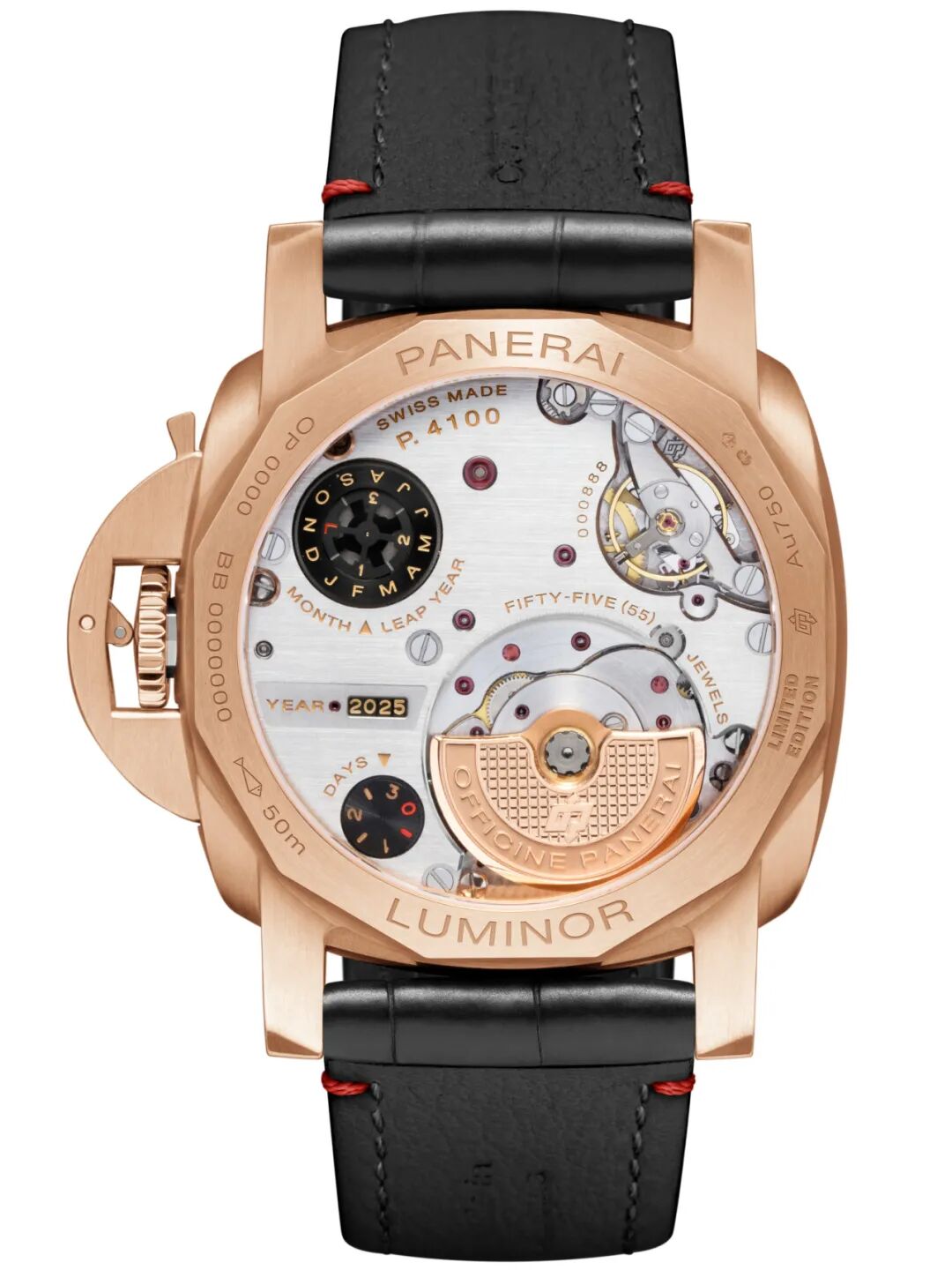沛纳海全新推出Luminor庐米诺系列44毫米万年历两地时红金腕表(PAM01688),以经典设计庆贺中国农历新年。新款腕表限量发行100枚,酒红色表盘尽显隽雅气质,与珍贵的沛纳海Goldtech™红金材质相得益彰。腕表型号采用中国传统文化中象征幸运的数字“88”,将吉祥寓意融入设计元素之中,传递对财富、繁荣以及对未来年年有余的美好祝愿。