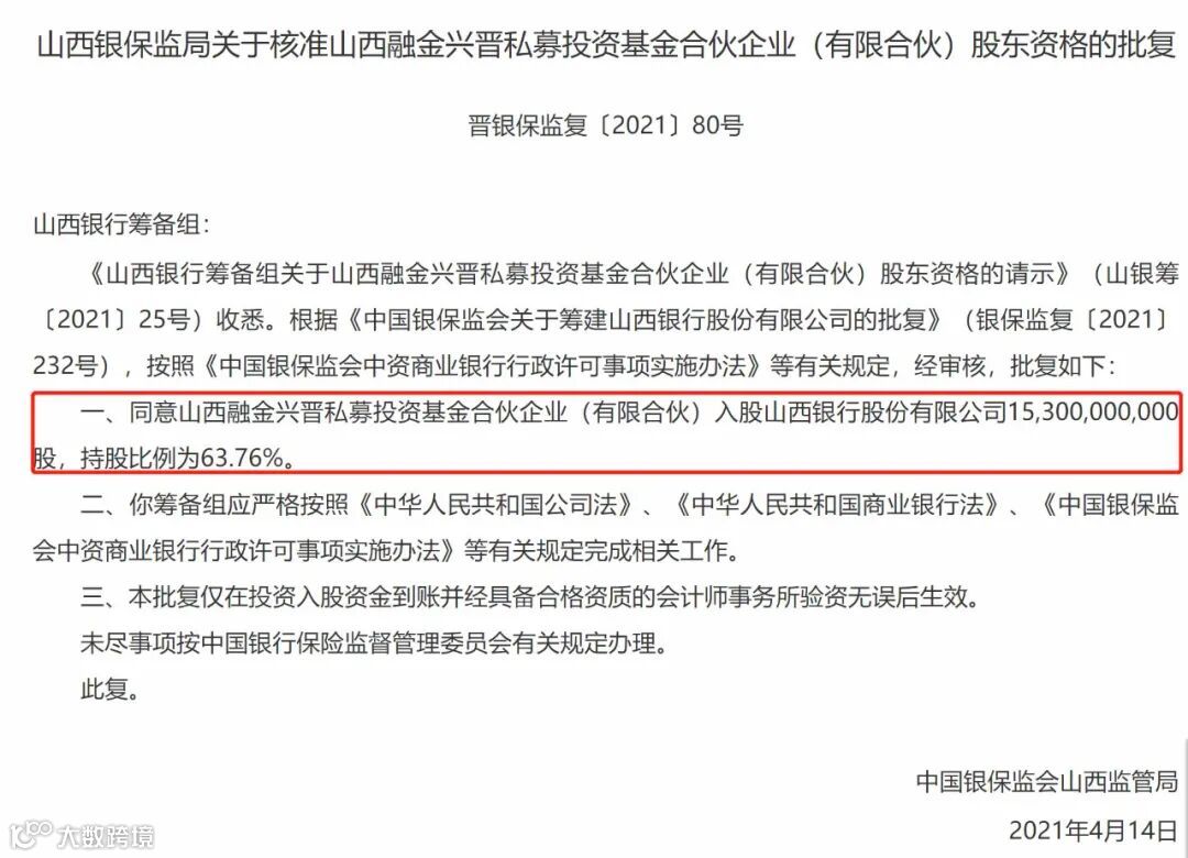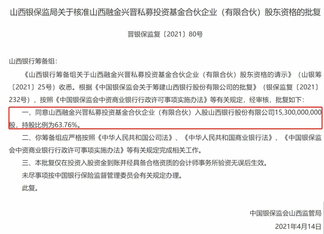 4月20日,银保监会官网披露,山西银保监局已于4月14日批复同意山西融金兴晋私募投资基金合伙企业(有限合伙)入股山西银行153亿股,持股比例为63.76%。