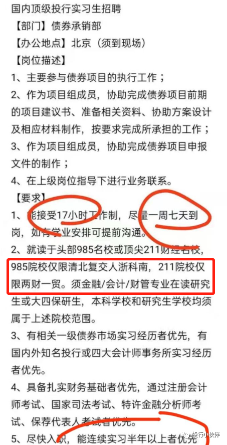 这两天,一份国内顶级投行实习生招聘的信息引起广泛关注:实习生要“能接受17小时工作制,尽量一周七天到岗”。