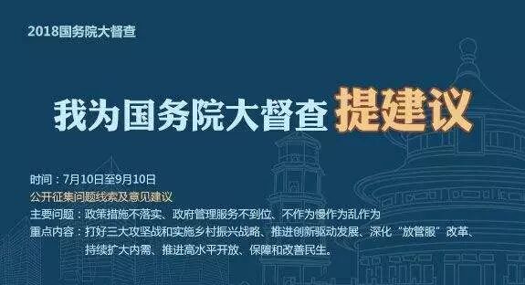 为做好2018年国务院大督查工作,充分倾听人民群众呼声,主动接受社会监督,从7月10日至9月10日,国务院办公厅督查室会同中国政府网开展“我为大督查提建议”活动,欢迎您反映政策措施不落实、政府管理服务不到位以及有关部门和单位不作为慢作为乱作为等问题,并提出意见和建议。