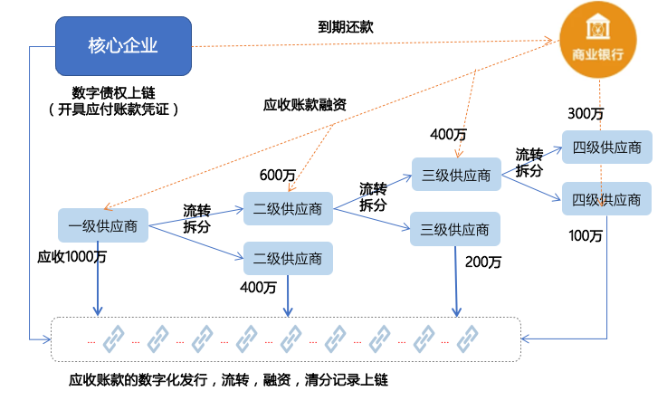 (3)融资申请:在核心企业确认的前提下,已经形成应收账款的1级供应商,可以向金融机构申请融资,或者将已确权的应收账款拆分给2级供应商。