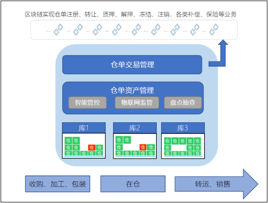 (1)从仓储货物的入库、入库调整、锁定、质押、解押、出库、退货入库等全流程数据第一时间上链,杜绝数据信息造假,使得仓单数据流转自身能形成一个完整的闭环,数据能自证清白;