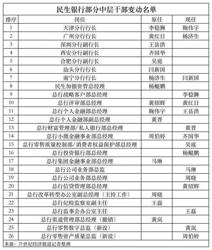 “革命要靠年轻人。”对于此次人员调整,一位民生银行总行部门副总向21世纪经济报道记者如此表示。