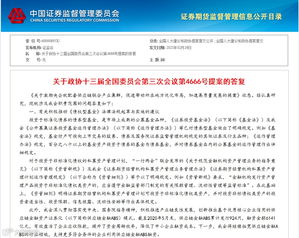 证监会在关于政协十三届全国委员会第三次会议第4666号提案的答复中表示,截至2020年5月末,供应链金融ABS累计发行924只,融资金额6141亿元,有效盘活了企业应收账款,提升了资金周转效率,降低了中小企业融资成本。