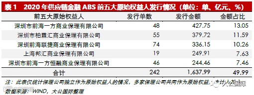 从原始权益人来看,供应链金融ABS的原始权益人以保理公司为主,保理公司在供应链金融ABS中主要作为“通道”角色,前五大原始权益人发行规模占比为49.99%。