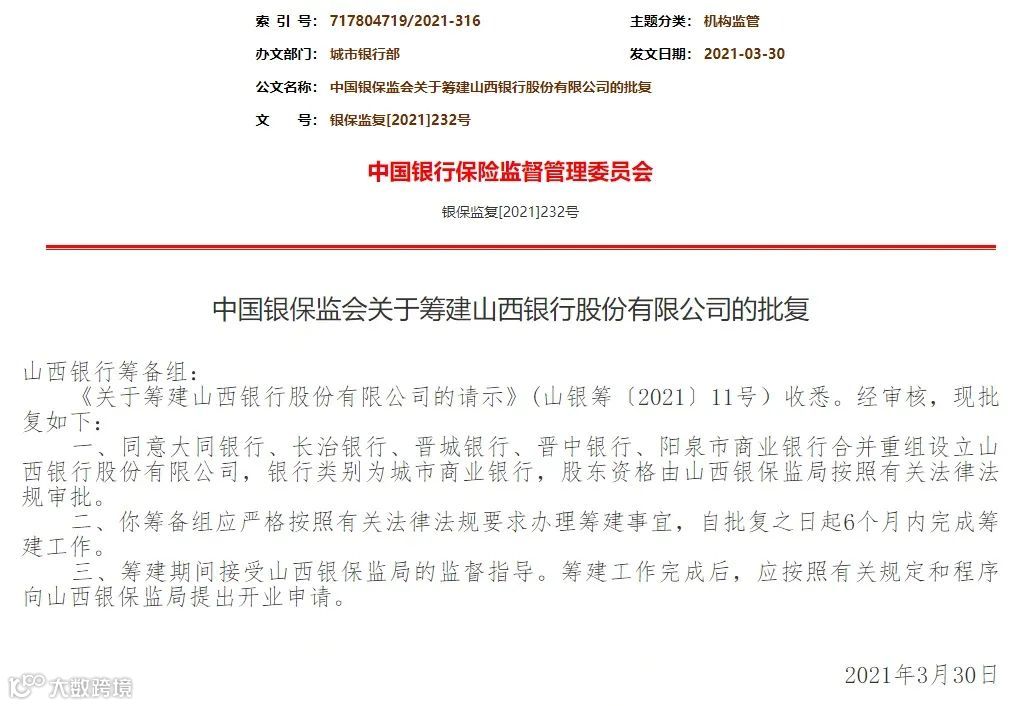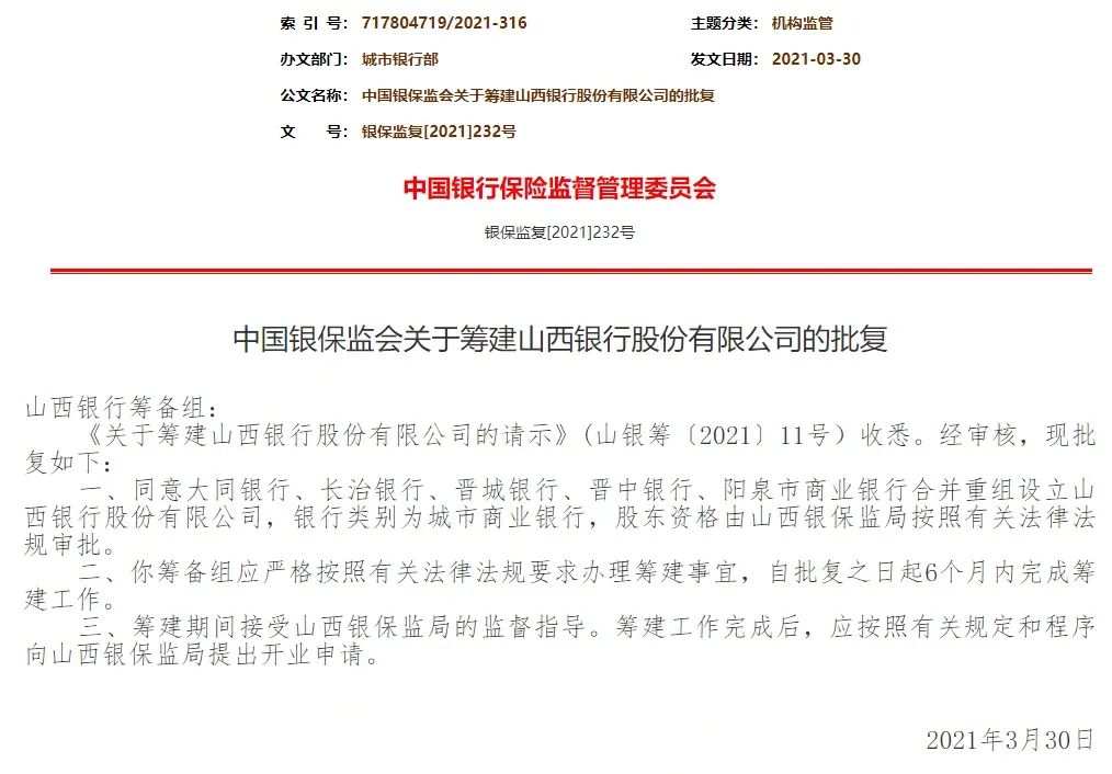 4月2日,银保监会官网发布的信息显示,银保监会3月30日批复同意大同银行、长治银行、晋城银行、晋中银行、阳泉市商业银行合并重组设立山西银行股份有限公司,银行类别为城市商业银行,股东资格由山西银保监局按照有关法律法规审批。