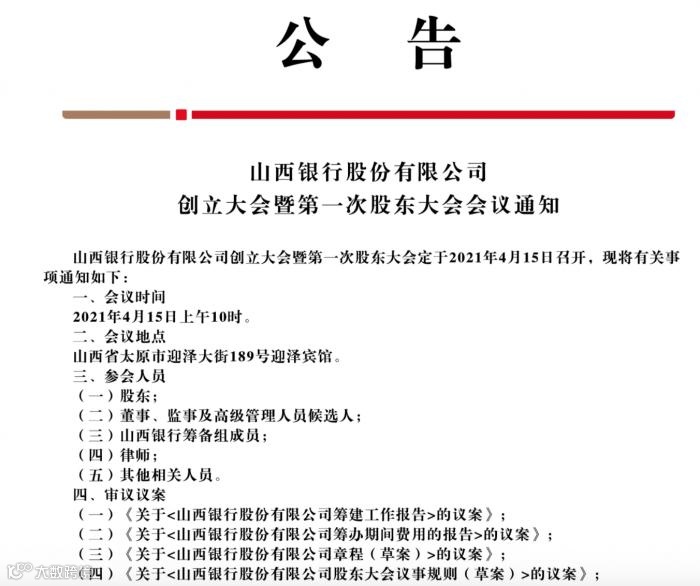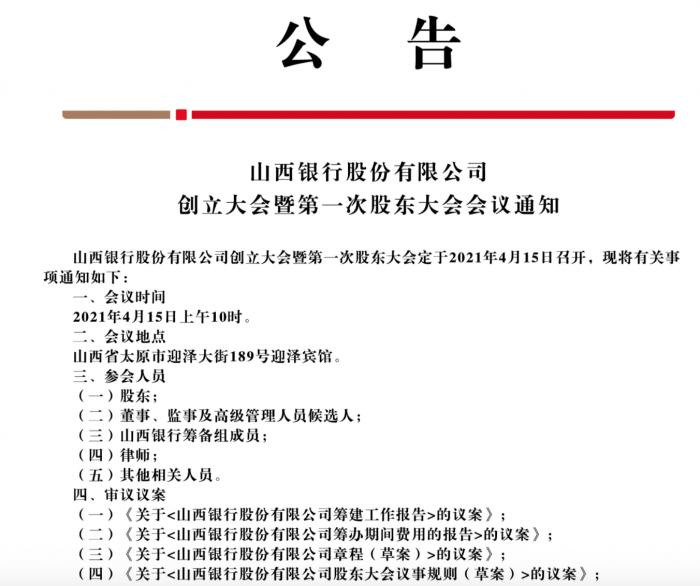 通知显示,创立大会暨第一次股东大会将于4月15日上午10时召开,参会成员包括股东,董事、监事及高级管理人员候选人,山西银行筹备组成员以及律师等。