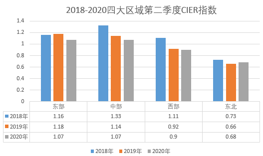 不仅黑龙江如此,吉林、辽宁同样如此,因为东北三省的就业环境差、薪资待遇低,这从最近3年的国内4大区域第二季度的CIER指数可以明显的看出来。