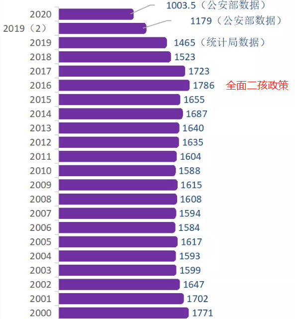 而按照公安部近期发布的《二〇二〇年全国姓名报告》显示,截止12月31日,2020年出生并到公安机关进行户籍登记的新生儿共1003.5万人,比2019年登记的1179万少了175万,降幅接近15%。