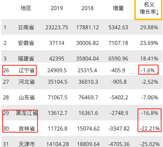 2019年,东北三省GDP都出现倒退,辽宁、吉林、黑龙江GDP增速分别为-1.6%、-22.21%、-16.8%。