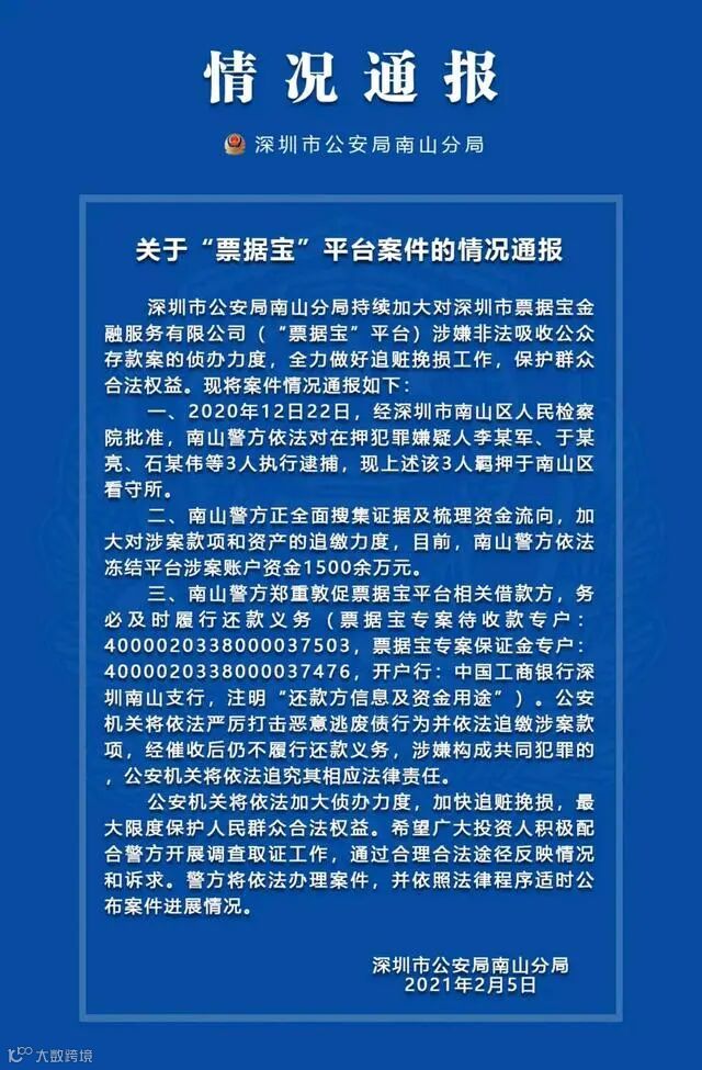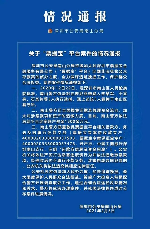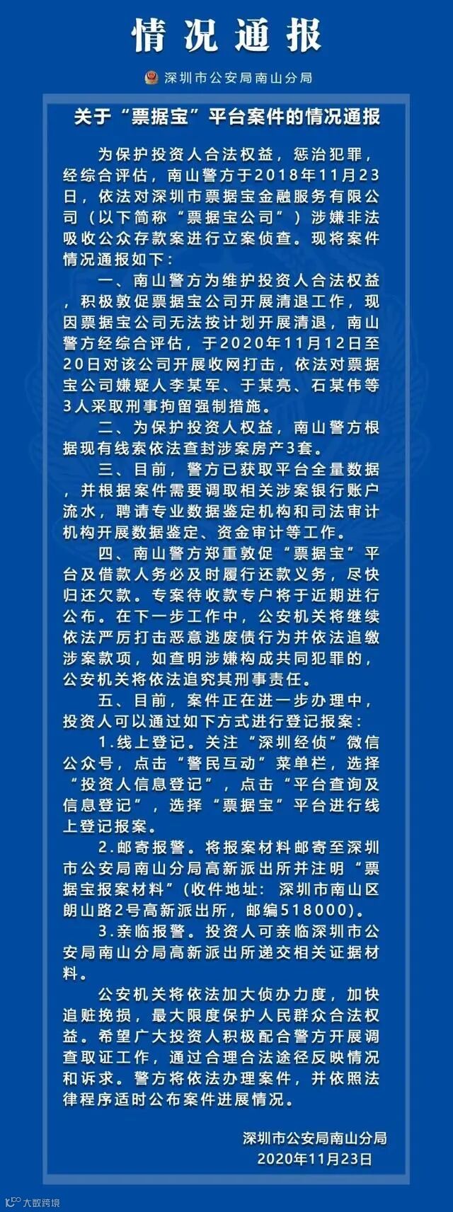 2020年11月27日消息,近日,深圳市公安局南山分局发布关于”票据宝"平台案件的情况通报显示,为维护投资人合法权益,积极敦促票据宝公司开展清退工作,现因票据宝公司无法按计划开展清退,南山警方经综合评估,于2020年11月12日至20日对该公司开展收网打击,依法对票据宝公司嫌疑人李某军、于某亮、石某伟等3人采取刑事拘留强制措施,根据现有线索依法查封涉案房产3套。