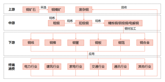 铜产品的生产过程分为铜矿采选、铜冶炼、铜材加工三个环节,根据铜产品生产环节对铜产业链进行划分,可分为上游的铜矿山企业、中游的铜冶炼企业和下游的铜材加工企业。