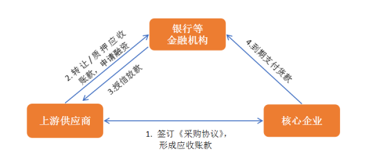 应收账款融资。铜行业核心企业与上游供应商之间签订《采购协议》,进而形成了应收账款。上游供应商将应收账款债权转让或质押给银行申请融资,银行和供应商通知核心企业并得到确认后,银行向供应商授信放款,核心企业根据约定到期支付货款。
