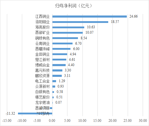 净利润方面,江西铜业归属母公司净利润为24.66亿元,位列铜行业19家上市公司净利润榜单第一。西部资源和*ST梦舟两家公司出现亏损,*ST梦舟亏损金额高达11.32亿元。