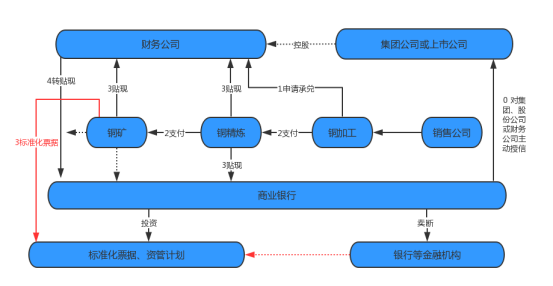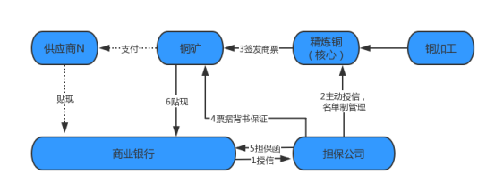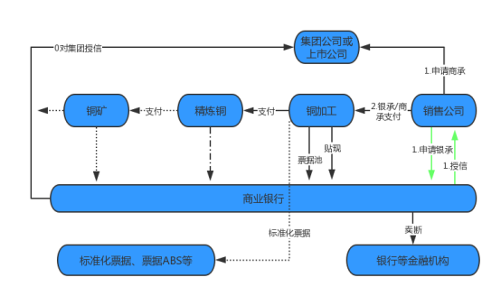 商业银行对铜行业集团、股份公司或财务公司进行主动授信,给予一定授信额度,铜加工企业向集团控股的财务公司申请承兑签发财票或商票,背书支付至上游-铜精炼企业,铜精炼企业可以选择将收到的财票或商票在财务公司贴现融资,或者在已经给予授信的商业银行贴现融资,也可以选择继续背书支付给上游-铜矿企业;