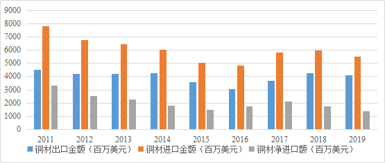 从进出口贸易情况来看,2011-2019年来,我国铜材一直呈现贸易逆差状态。2011年净进口额达到了3302.47百万美元,之后有所下降,出口额则较为稳定。2019年铜材出口金额4114.95百万美元,进口金额为5482.15百万美元,净进口额为1367.20百万美元。