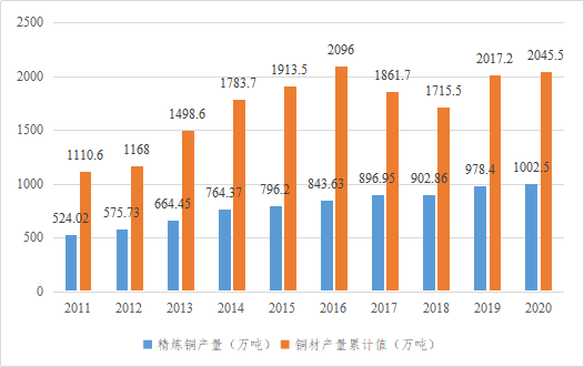 从产量情况来看,我国铜行业总体运行平稳,精炼铜产量保持稳定增长势态。2020年12月全国精炼铜产量98.6万吨,同比增长10.9%;2020年全国精炼铜累计产量1002.5万吨,同比增长7.4%。过去十年中,我国铜产业在经历了2011-2016年的快速增长阶段后,年累计产量维持在2000万吨左右;精炼铜产量逐年递增,年均增速达到19.13%。