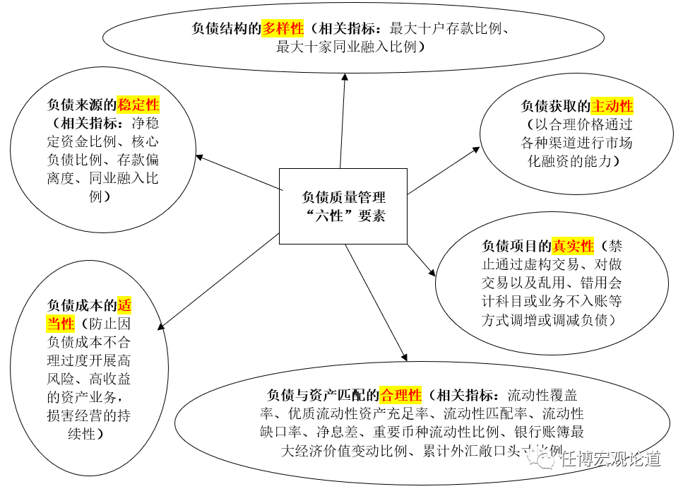(一)在商业银行传统的三性经营要求(流动性、安全性和盈利性)外,文件对商业银行负债质量管理特别提出“六性”要求,即负债来源的稳定性、负债结构的多样性、负债与资产匹配的合理性、负债获取的主动性、负债成本的适当性以及负债项目的真实性。