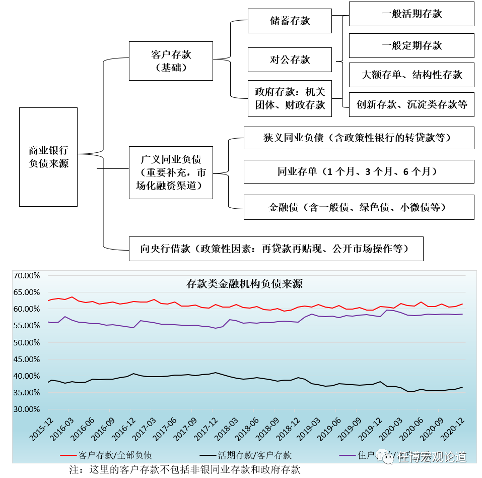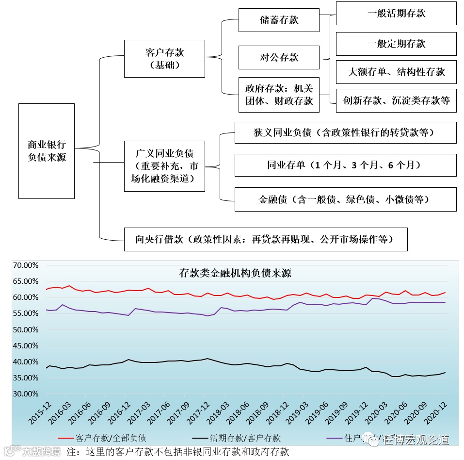 (二)从具体数值来看,客户存款(这里仅包括零售存款和企业存款、不含政府存款和非银同业存款)占商业银行全部负债来源的60%左右,相对较为稳定。其中,客户存款的35-40%由活期存款构成、55-60%零售存款构成。