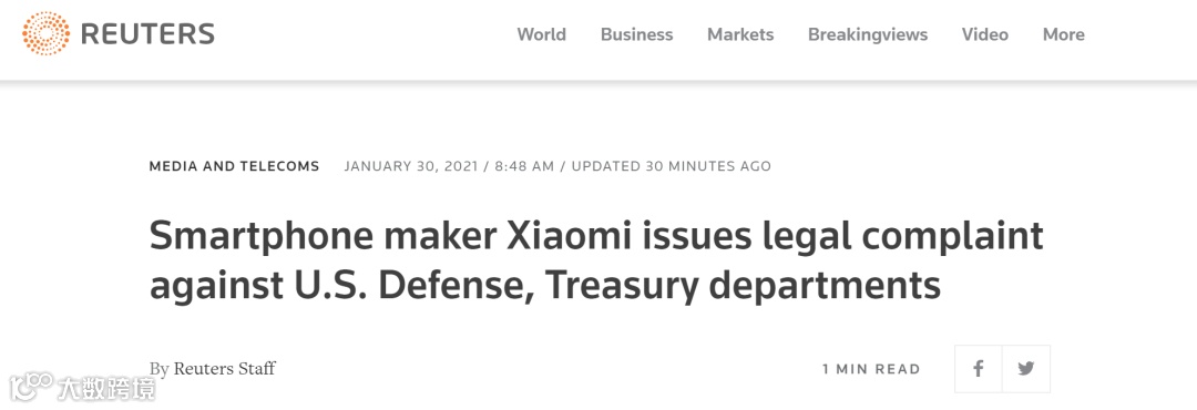 延伸阅读:刚刚,小米把美国国防部和财政部告了!