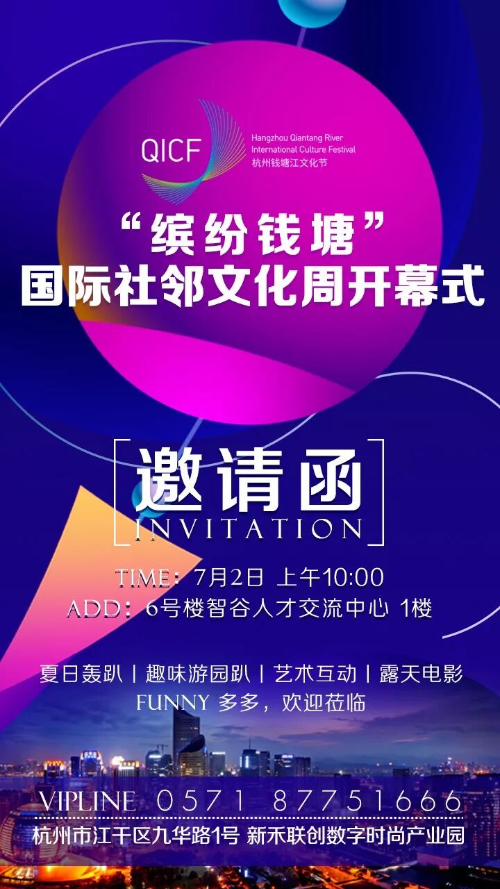 “缤纷钱塘”国际社邻文化周开幕式暨新禾联创数字时尚产业园开园仪式将于2018年7月2日上午10点在新禾联创数字时尚产业园6号楼报告厅(江干区九华路1号)盛大举行!活动主题为“亲睦和美 缤纷钱塘”,跟着小编一起看看活动安排吧~