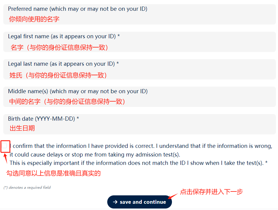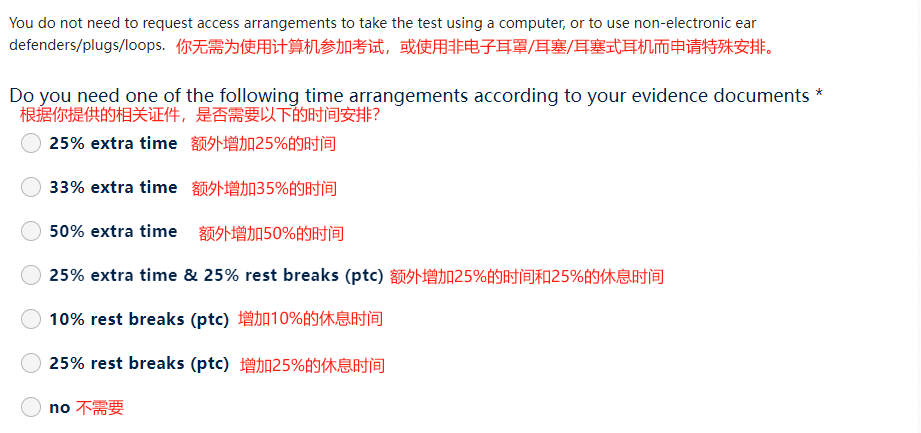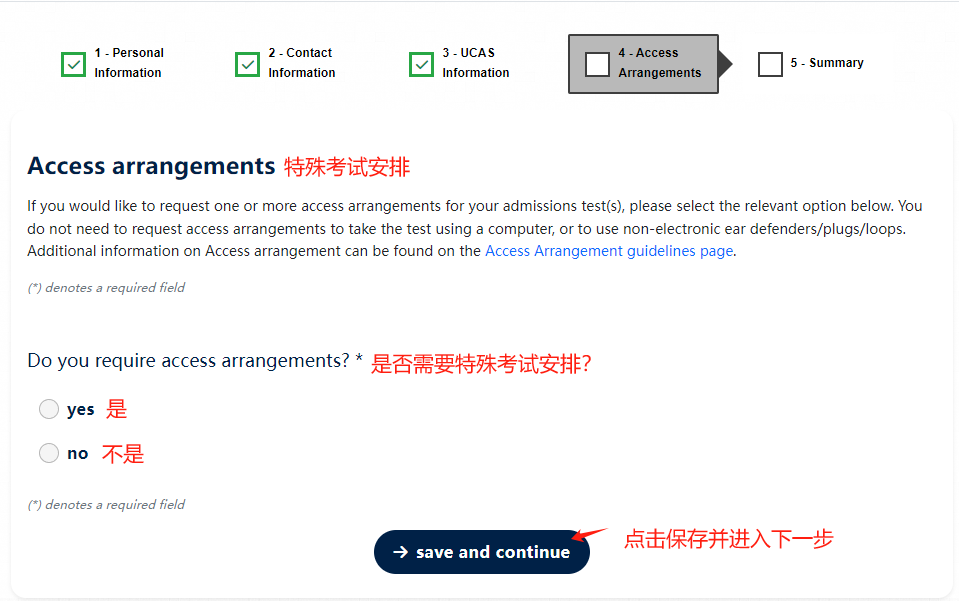 这一项是给有特殊安排的考生进行选择的,如果你在考试时不需要特殊安排,则点击【no】,再点击【save and continue】进入下一步。